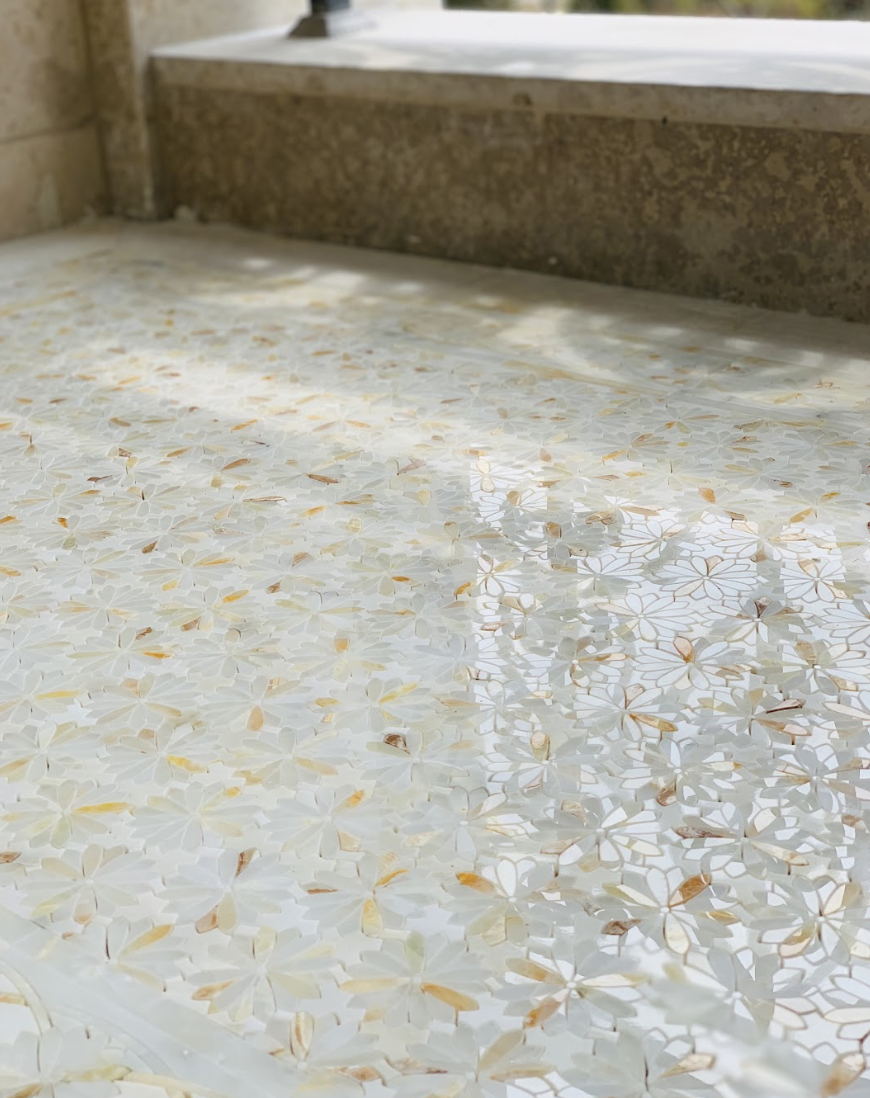 Delicate yet dynamic, Daisy reimagines floral design through the artistry of natural stone. Precision waterjet cutting forms a repeating petal motif, blending luminous whites with warm honey and soft neutral tones to create depth, movement, and subtle contrast. The layered pattern feels light and airy while maintaining a sense of structure, making Daisy an elegant choice for feature floors, backsplashes, shower surrounds, and powder rooms. Its refined palette allows the intricate craftsmanship to shine without overwhelming the space, pairing beautifully with both classic and contemporary interiors. Daisy is a graceful expression of stone and design: timeless, versatile, and thoughtfully detailed.