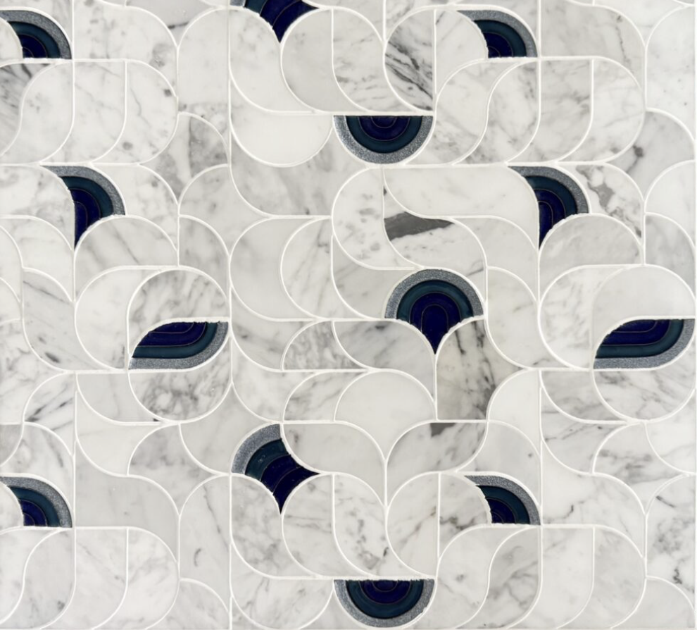 Symphony is a striking waterjet mosaic that brings rhythm and movement to natural stone design. Crafted from elegant white marble, the pattern features flowing curved forms that interlock seamlessly, creating a sophisticated geometric composition. Deep blue stone inlays add contrast and depth, drawing the eye and elevating the overall design.